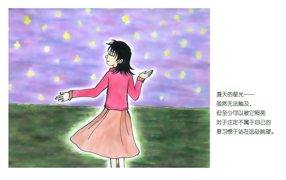 这几天和猫儿在她博客上谈到“共鸣”的话题,于是我想有时我们也许并不是收不到共鸣,而是在恐惧中下意识地做了闲置的乐器。而令我们惧怕的其实也并非发出声音本身,而是发现就算自己投入身心去演奏或是站在山顶用力呐喊,也始终得不到所期望的和音,甚至连回声也都听不到。所以我们选择将自己的音色深藏起来,放弃了继续寻找共鸣的努力。这是没有办法的。冥王星人要怎样才能奏出地球人的音乐呢?明知道行不通,却又无法返回,就是被困在这样一个中途半端的境地。而唯一庆幸的是,还好,我没有多少用来寂寞的时间,因为我已经习惯了自己对自己歌唱。