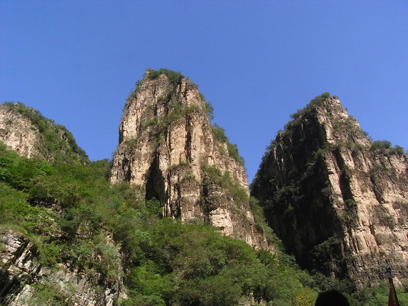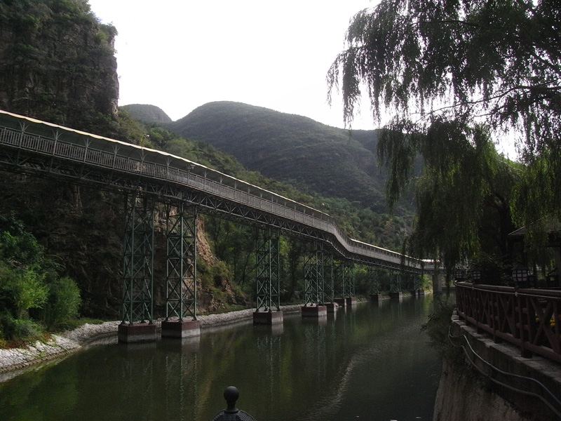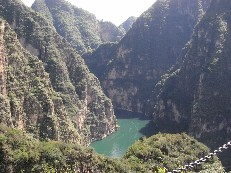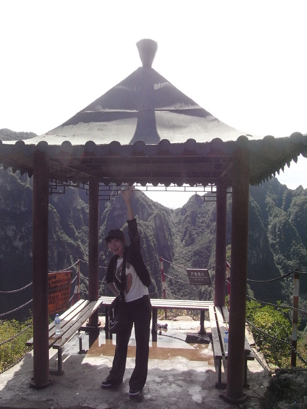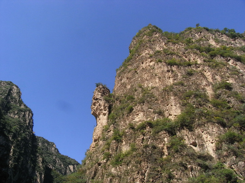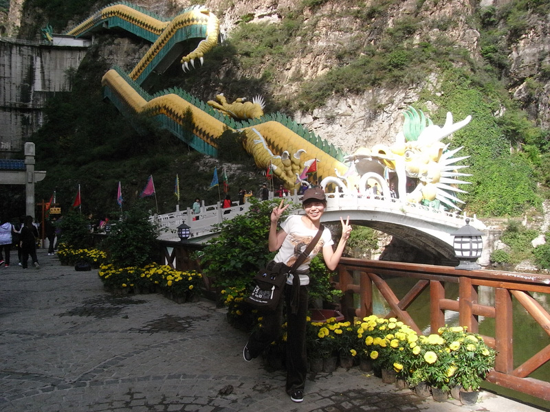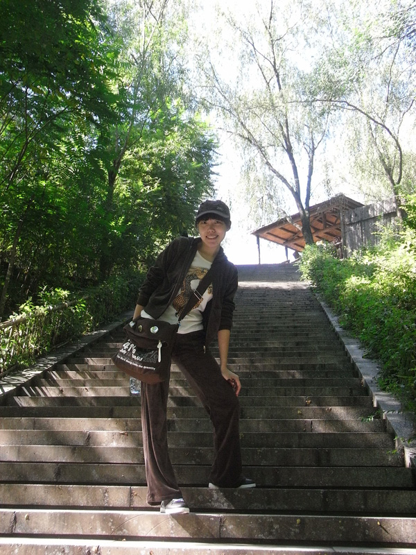 船在月亮湾停靠以后就是自由活动时间了,老大说你们两个再去玩儿会吧,于是我跟YE就去爬山了(←其实就是我的馊主意呃)。说来也很久没爬过山…就连自家蟒山也是= =于是体力还是蛮成问题的,绕过几个弯就喘得厉害了。好在是龙庆峡而不是峨眉山,最终还是被我们征服了。山路的尽头是一座名叫“梦幻亭”的小亭子,很简陋,跟名字有点不太相符,不晓得是不是故意想让人有种好梦破灭的感觉(汗)。路上我一直在前面(YE说我跑得很快),爬到亭子里的时候两个人都已经满头是汗了。不过似乎爬到那里的也只有我们两个,所以还是挺有成就感的。喘了口气,突然有种冲动上来,于是就站在顶上向远处大声地喊“喂”,喊“我们到了”。等到听到山上的回声,才算是彻底尽兴了,拍了一堆照片以后开始下山。