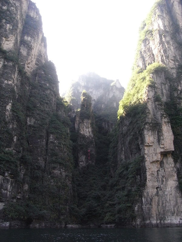 边聊边走路进去,进龙嘴里的电梯,发现真是山路十八弯,一趟接一趟。出来以后去坐船,沿途的风景很美好,碧水青山,有时有种重回都江堰的错觉。船上吹着风很是凉爽,看着水波拍打岸边的岩石,觉得非常惬意。